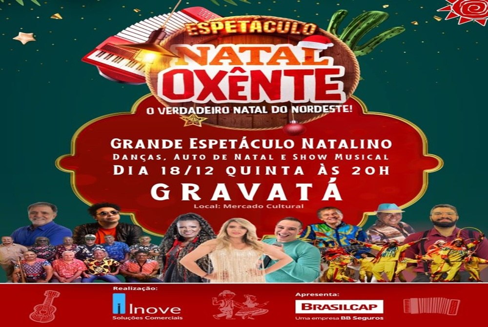 A iniciativa reforça a importância de preservar as tradições nordestinas e celebrar a alegria e a riqueza cultural da região. O “Natal Oxente” é uma realização da Inove Eventos com o patrocínio do Brasil Cap e conta com o apoio da Prefeitura Municipal de Gravatá por meio das Secretarias de Turismo, Cultura, Esportes e Lazer, de Comunicação e Imprensa, de Segurança e Defesa Civil junto a Guarda Civil Municipal, de Saúde, de Indústria e Comércio e de Assistência Social e Juventude.